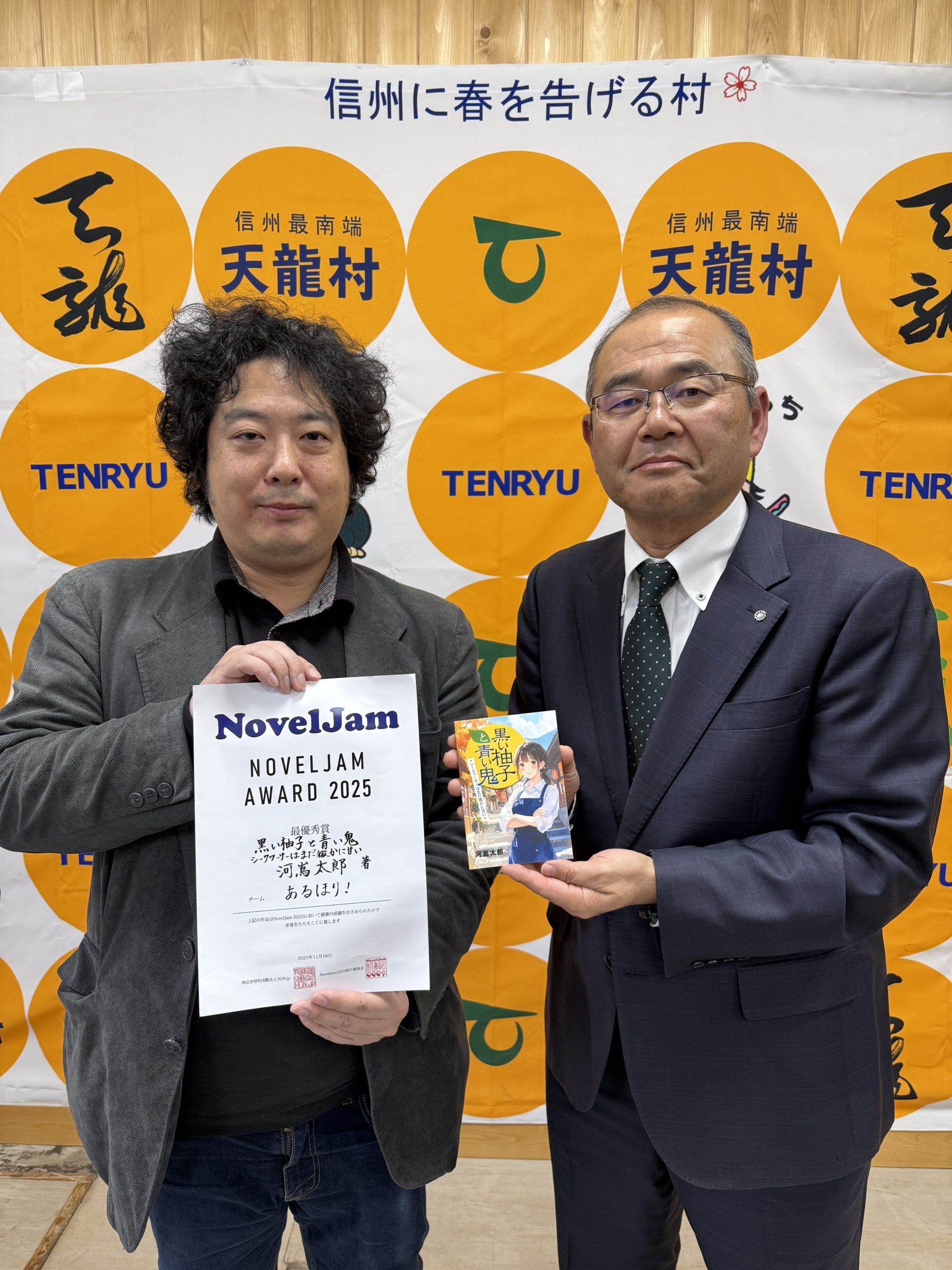 同日、ジャーナリストの河嶌太郎氏が執筆した「黒い柚子と青い鬼 シークワーサーはまだ微かに甘い」という短編小説が、この度「NOVEL JAM 2025」の最優秀賞に輝き、本日、ご本人が役場に表敬訪問してくれましたました。